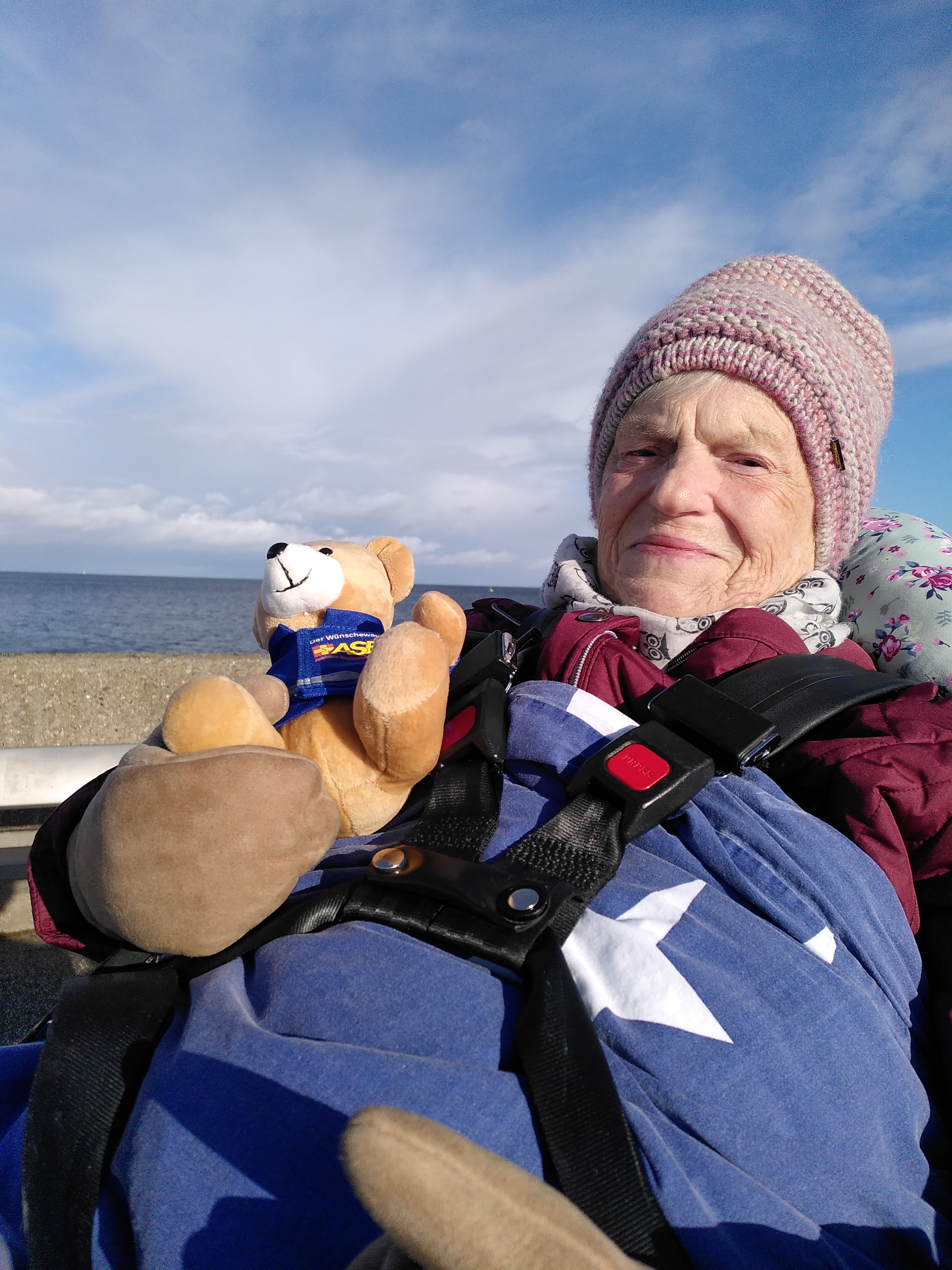 Die Fahrt war von entspannter, gelöster Stimmung geprägt. Karin hielt den Wünschewagenteddy fest im Arm, während sie sich immer mehr auf das Meer freute. Je näher wir dem Ziel kamen, desto lichter wurde der Himmel. Und dann, wie ein kleines Wunder, empfing uns Travemünde mit strahlendem Sonnenschein und blauem Himmel.